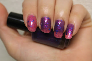 This polish is really neat. It is a purple jelly polish, which changes to a light pink when warm, with small magenta glitter and med and large blue hexagonal glitter. When I first put the polish on, my hands were freezing, as they usually are, so I turned on my wall heater and started warming them up. Below you can see the color change transitions.